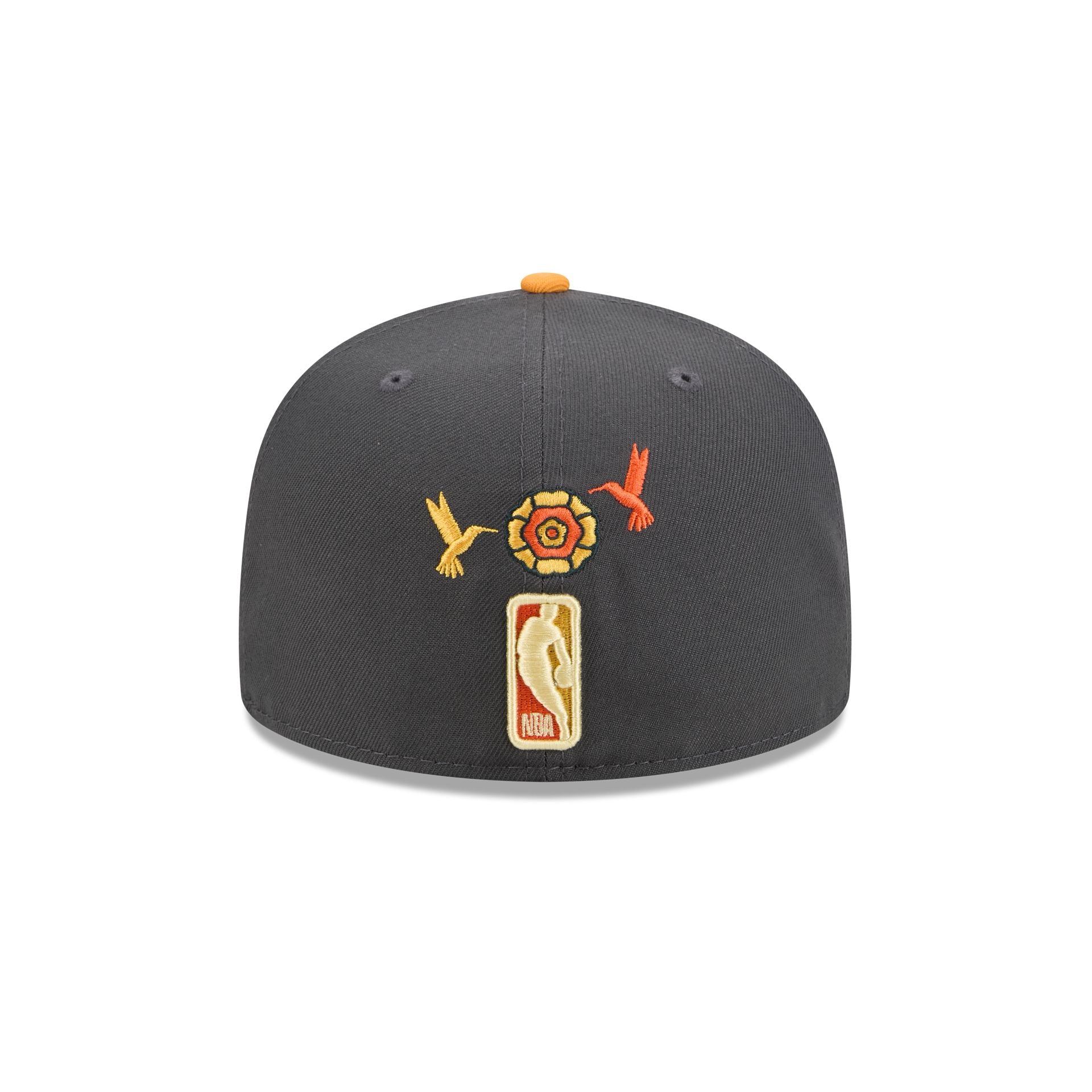 The Boston Celtics Day of the Dead Graphite 59FIFTY Fitted Cap features an embroidered Celtics logo at the front panels with marigold (cempasúchil) and hummingbird designs throughout, representing the Legend of Xóchitl and Huitzilin. Additional details include a team patch at the right-wear side and a matching NBA Logoman logo at the rear.
