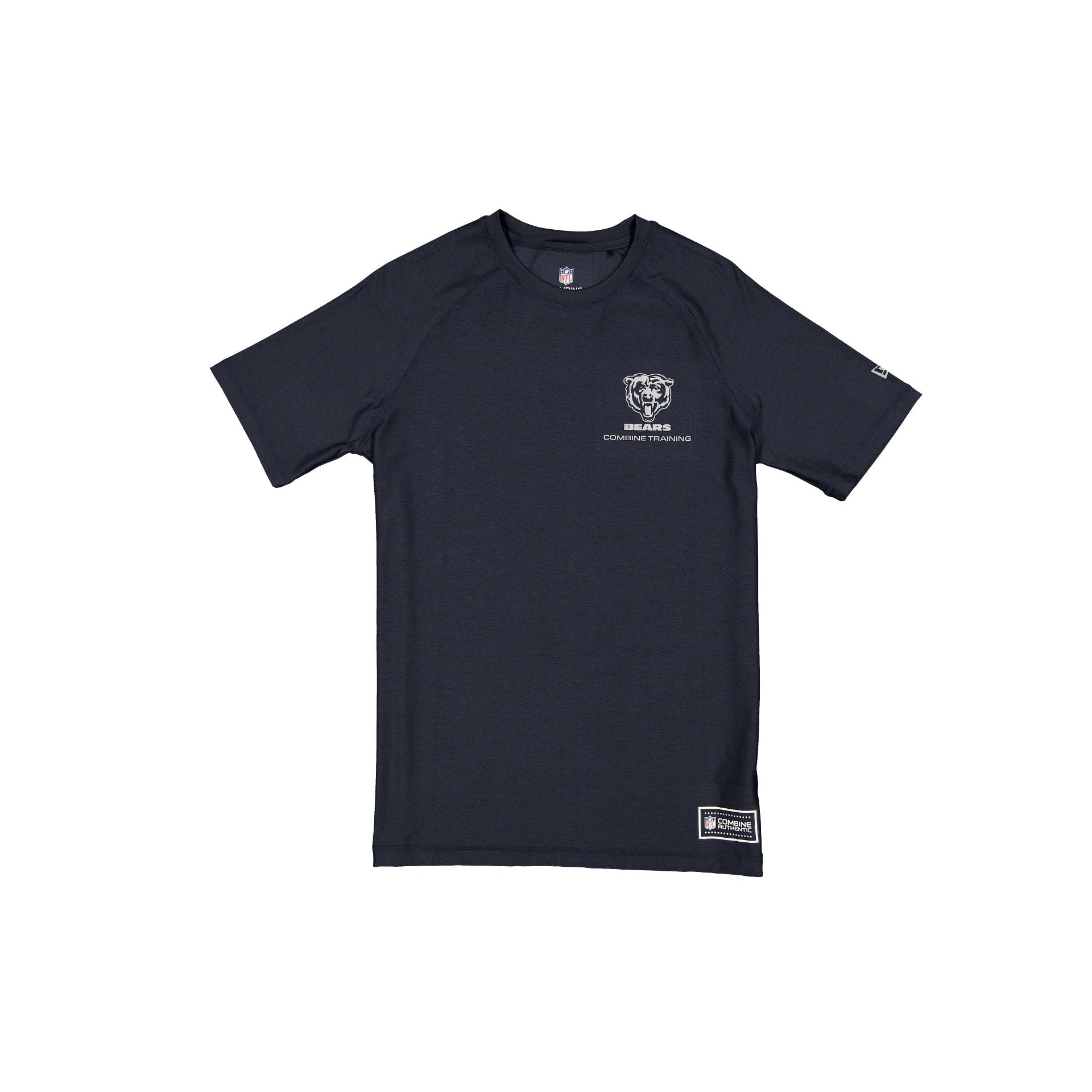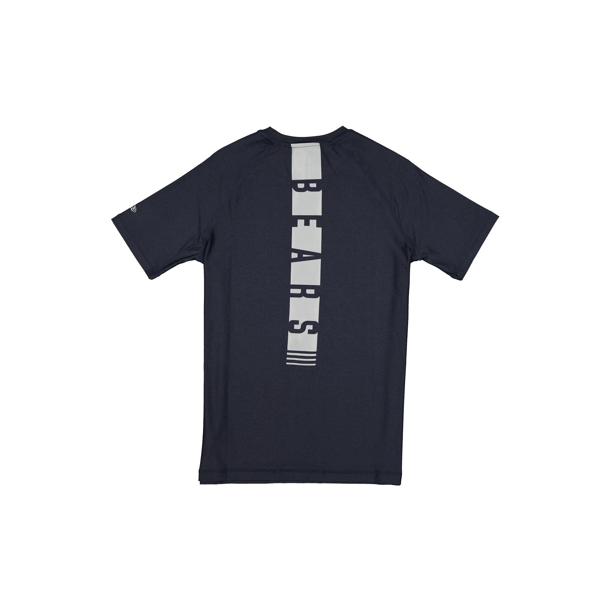 The Chicago Bears 2025 Functional Fandom Short Sleeve T-Shirt features a reflective screen-print Bears logo at the left chest with a matching team wordmark graphic down the back and an Official NFL Combine Authentic patch at the left hip. Additional details include moisture-wicking and antimicrobial fabric with UV protection.