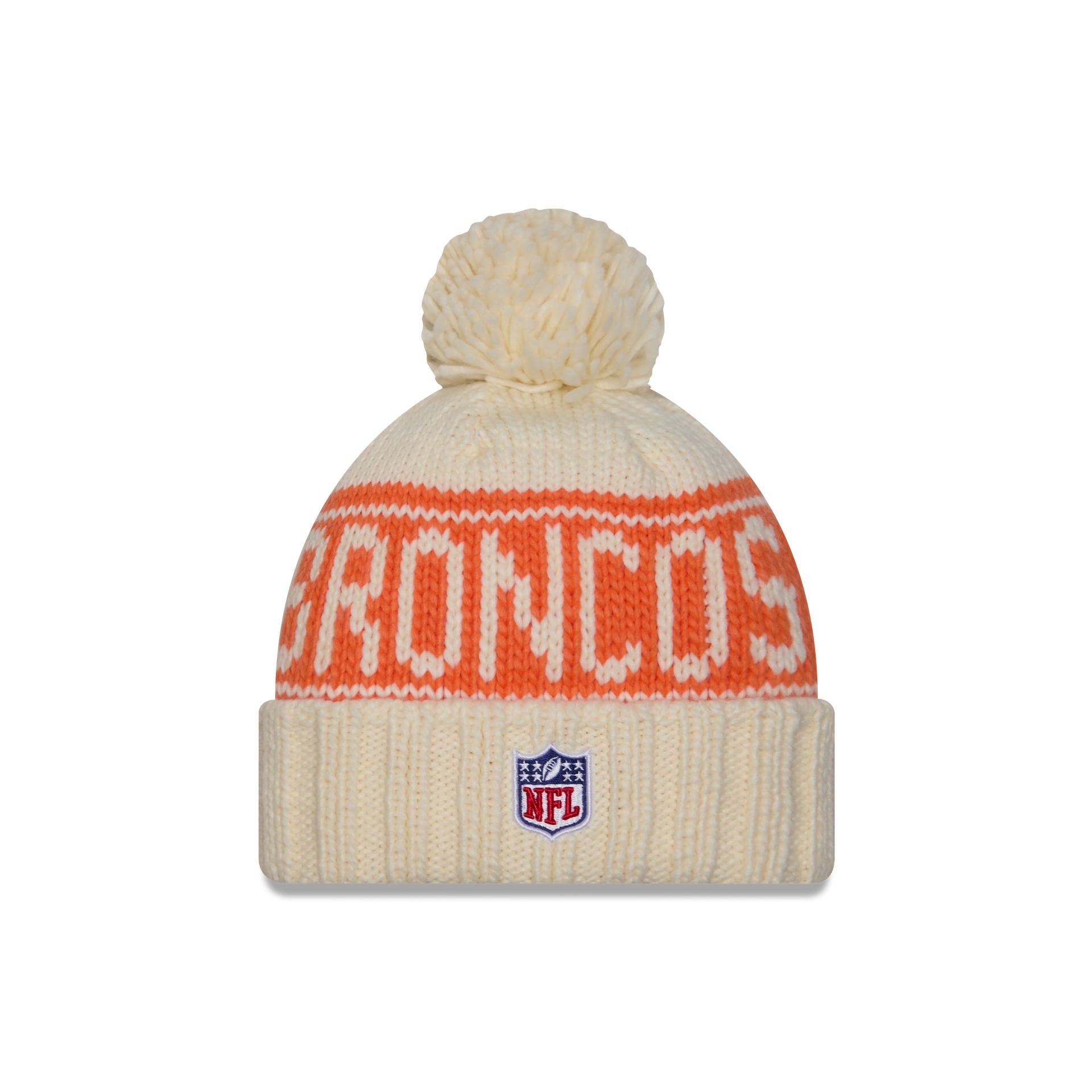 The Denver Broncos 2024 Cold Weather Chrome Pom Knit Hat features an embroidered Broncos logo at the front cuff with a matching NFL Shield at the rear. Additional details include a team wordmark at the crown and a one-time removable pom.