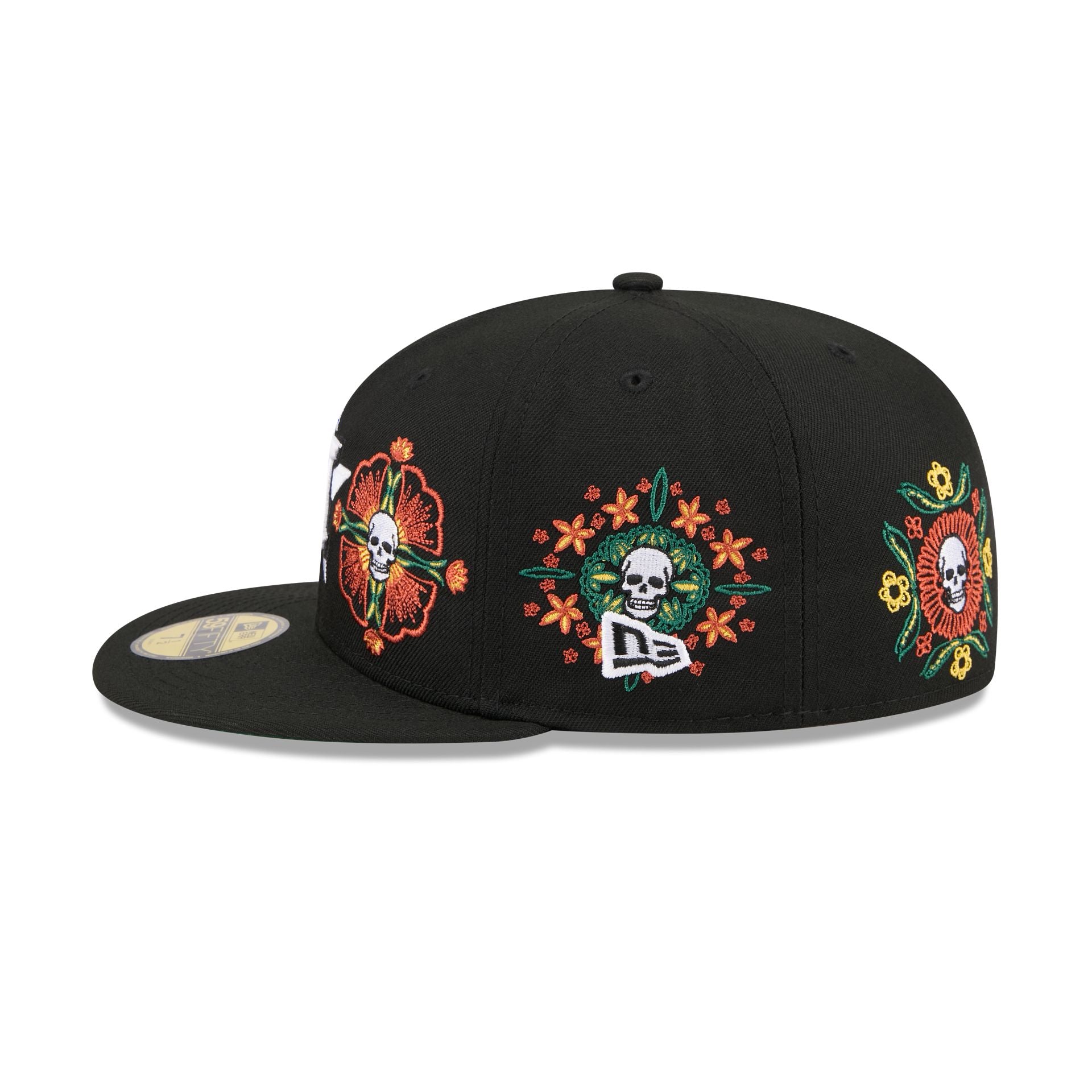 The Houston Astros Day of the Dead Skull & Flowers 59FIFTY Fitted Cap features an embroidered Astros logo at the front panels with Day of the Dead floral embroidery throughout the cap. Additional details include the MLB Batterman logo at the rear and a green undervisor.
