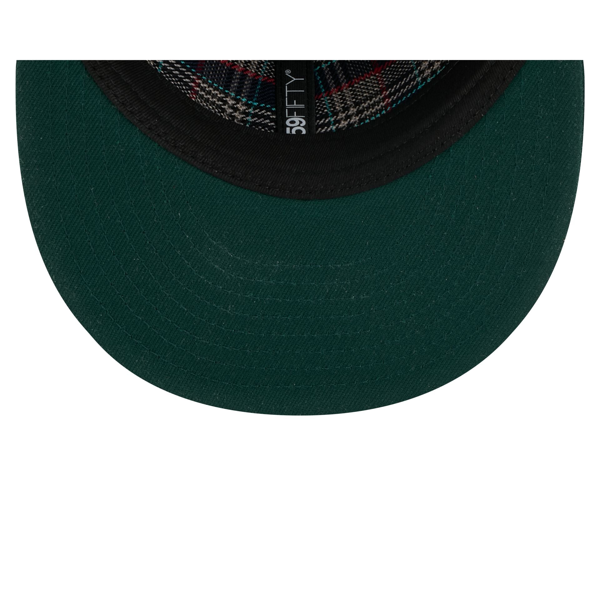 The Just Caps Plaid Interior Denver Nuggets Retro Crown 59FIFTY Fitted Cap features an embroidered Nuggets wordmark at the front panels with a matching NBA Logoman at the rear, a green visor, and a plaid lined interior.