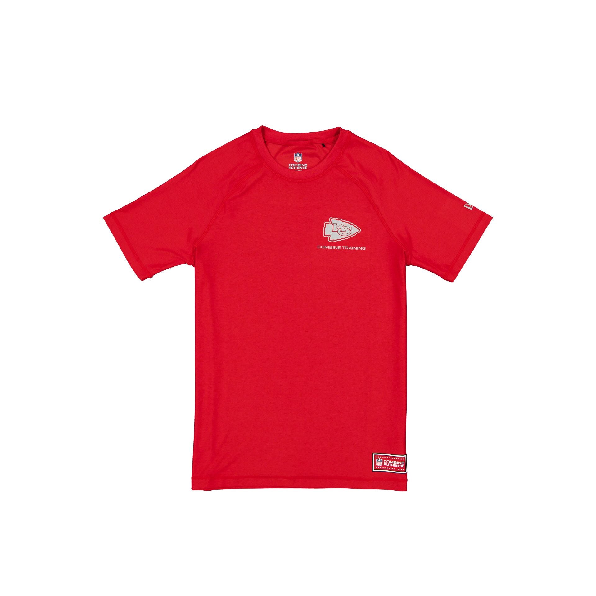 The Kansas City Chiefs 2025 Functional Fandom Short Sleeve T-Shirt features a reflective screen-print Chiefs logo at the left chest with a matching team wordmark graphic down the back and an Official NFL Combine Authentic patch at the left hip. Additional details include moisture-wicking and antimicrobial fabric with UV protection.