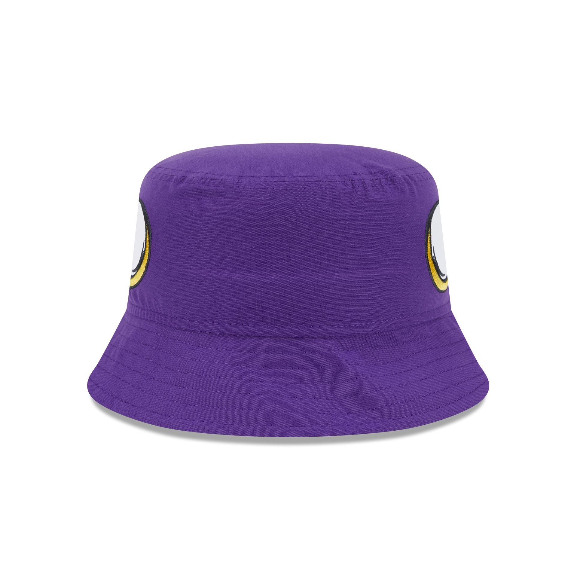 The Minnesota Vikings Helmet Bucket Hat features an embroidered Vikings helmet design throughout.