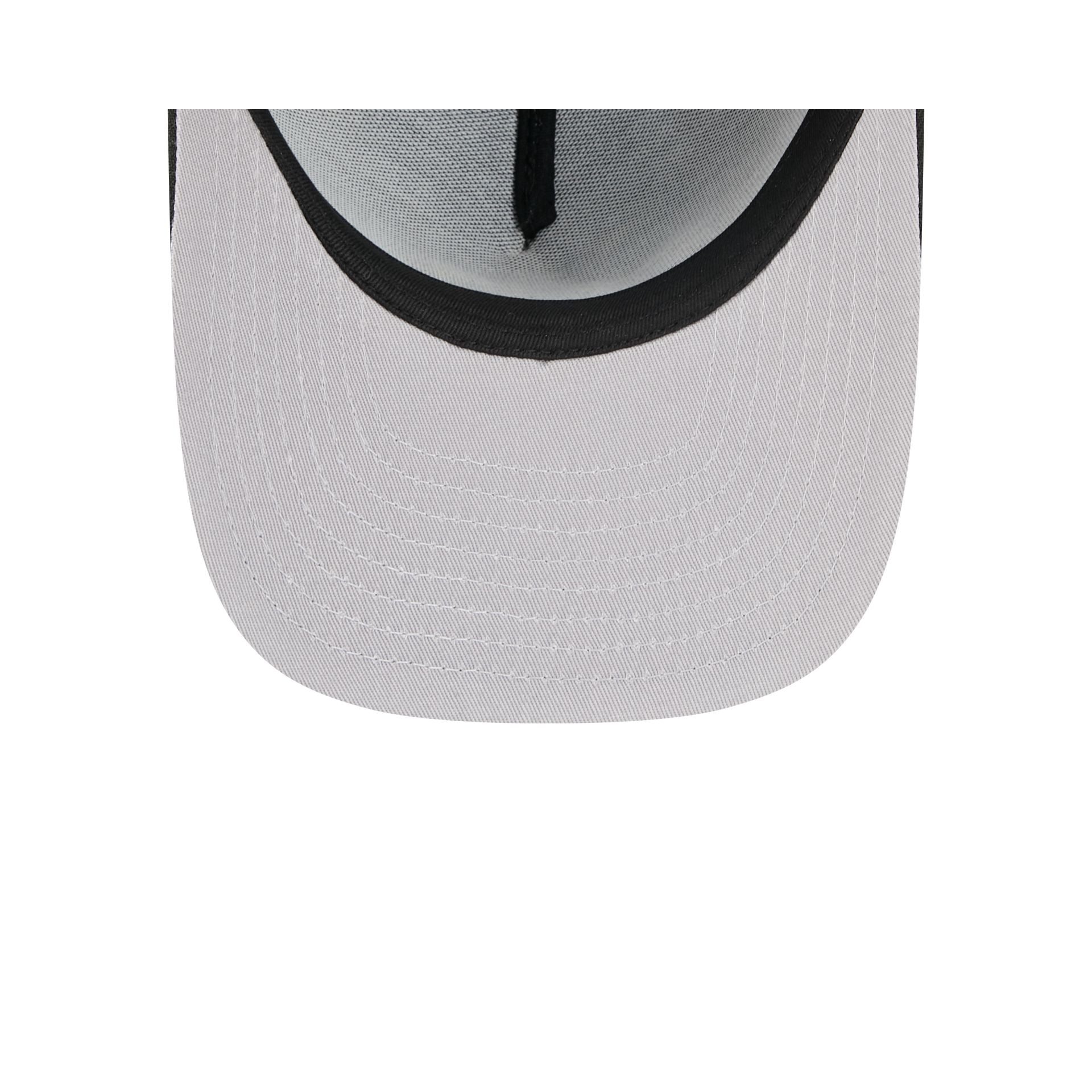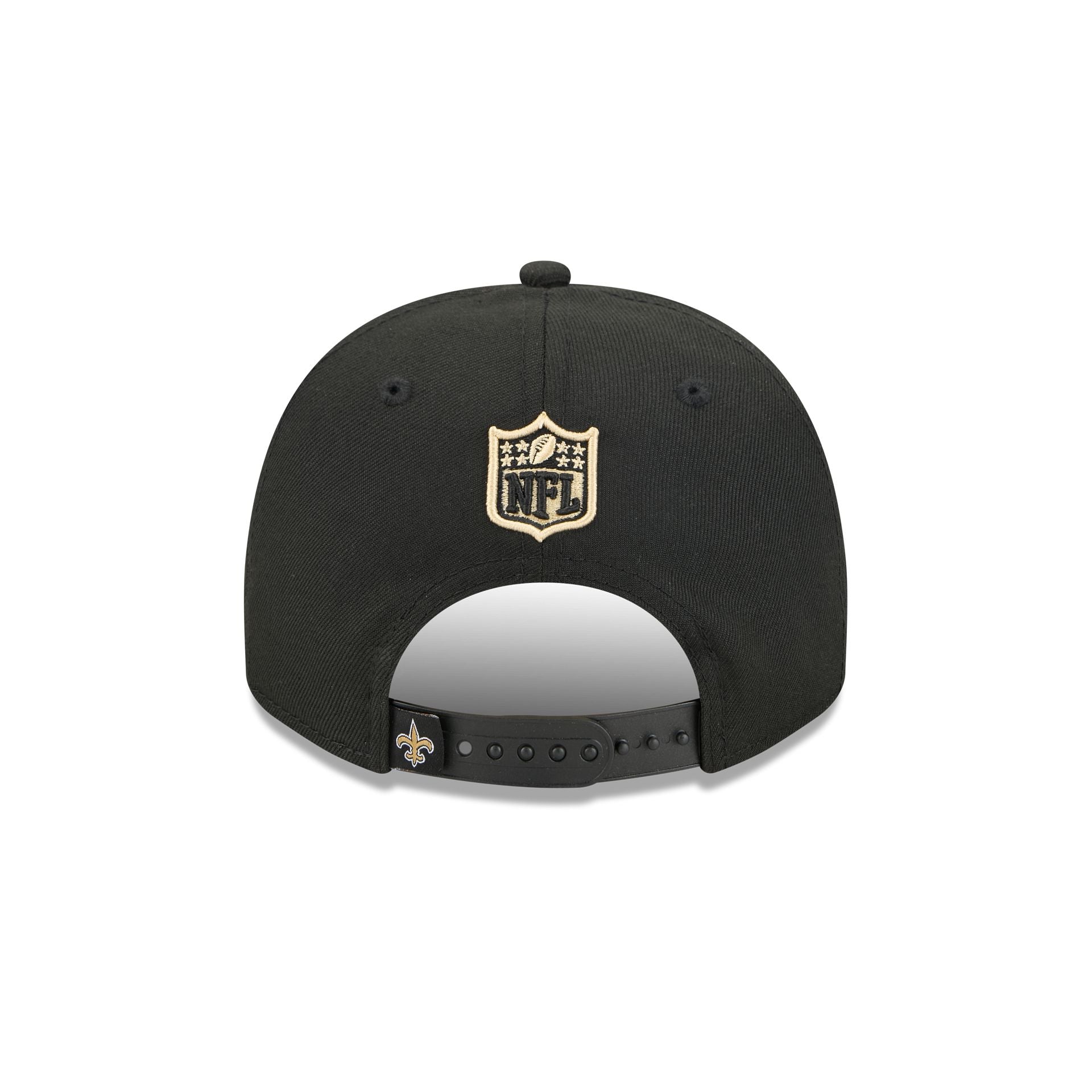 The New Orleans Saints Cartoon 9FIFTY A-Frame Snapback features an embroidered Saints cartoon themed logo at the front with a matching NFL Shield above a snapback closure at the rear. Additional details include a monochromatic embroidered team logo at the right-wear side and a gray undervisor.