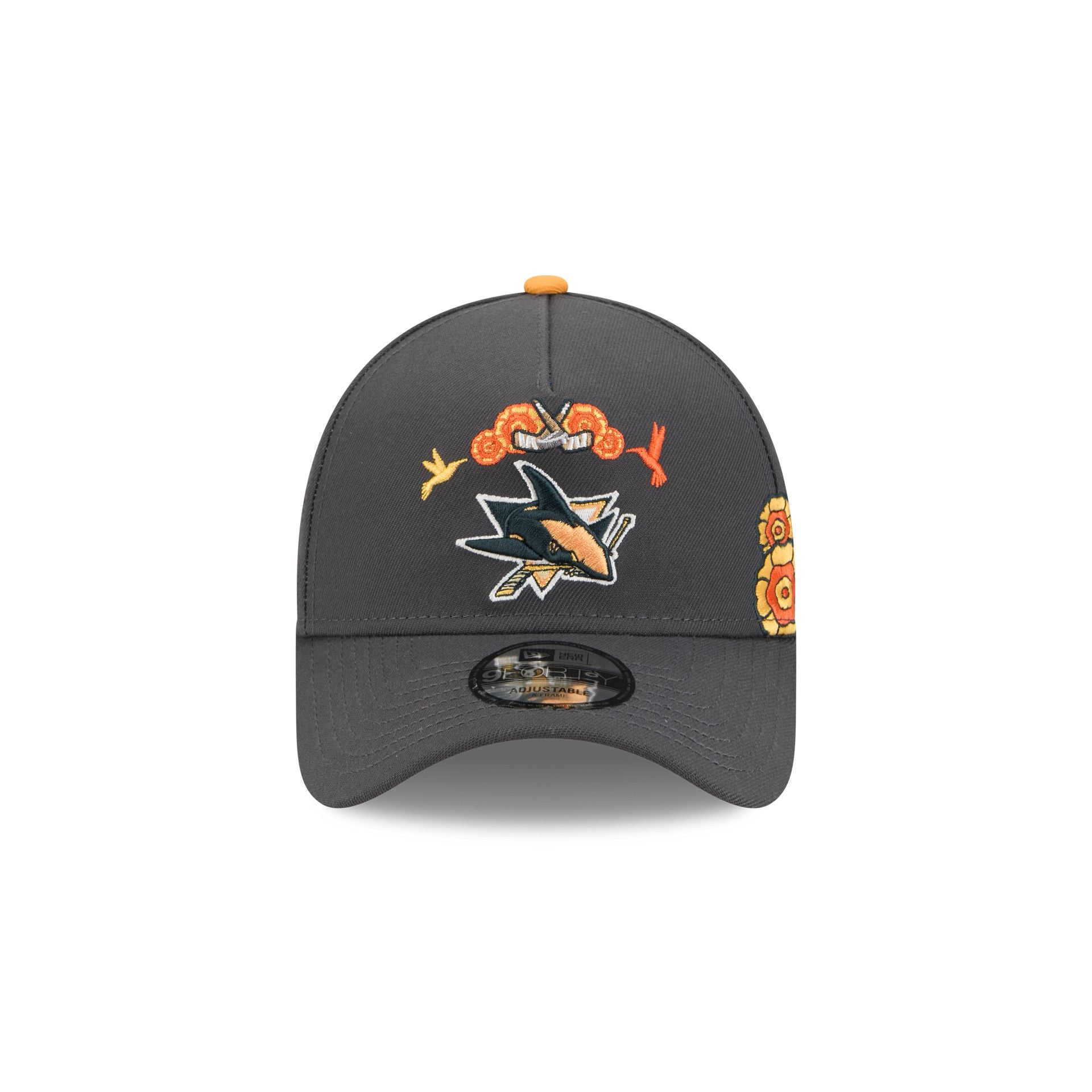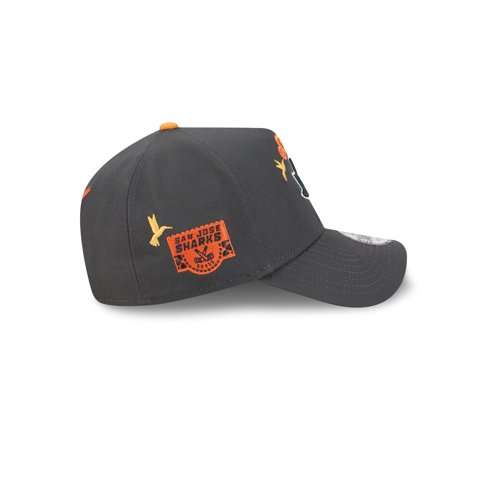 The San Jose Sharks Day of the Dead Graphite 9FORTY A-Frame Snapback features an embroidered Sharks logo at the front panels with marigold (cempasúchil) and hummingbird designs throughout, representing the Legend of Xóchitl and Huitzilin. Additional details include a team patch at the right-wear side and an adjustable snapback closure at the rear.