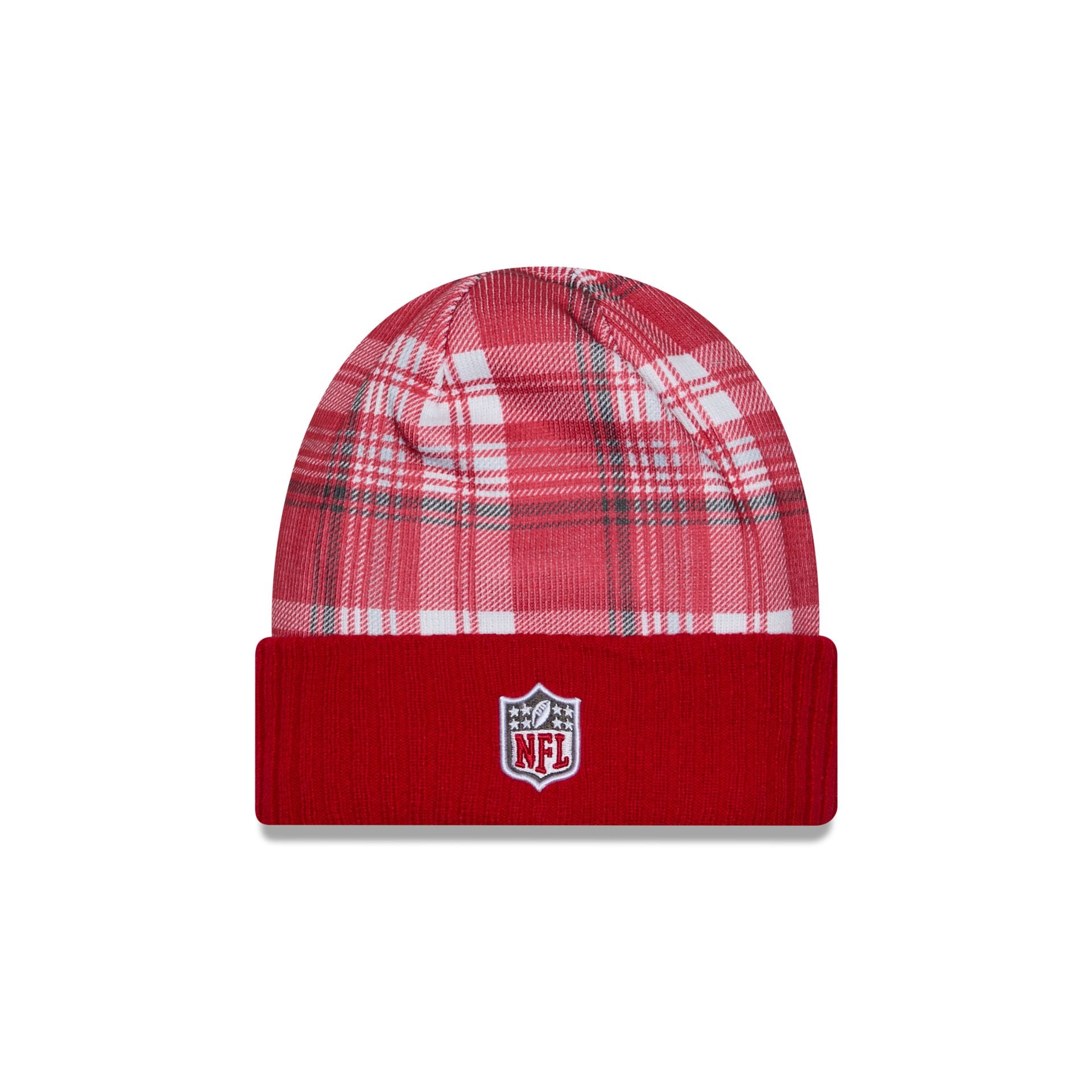 The Tampa Bay Buccaneers 2024 Cold Weather Statement Knit Beanie features an embroidered Buccaneers logo at the front cuff with a matching NFL Shield at the rear and a plaid print throughout the crown.